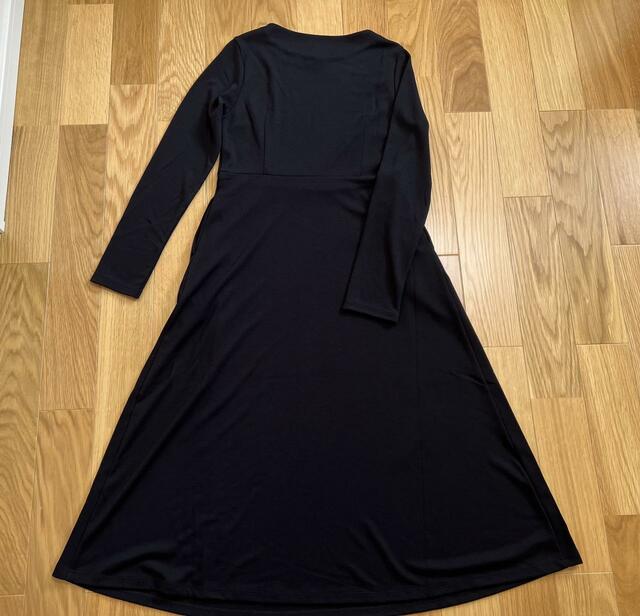ワンピースはデザインによっては重ね着を楽しんだり、大きめサイズでゆるく着たりすることもありますが、ユニクロの「ポンチフレアワンピース」はタイトに着るのが断然おすすめ。エレガントな印象に仕上がりますよ。
