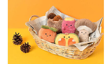 「秋の味覚ぽちゃまる」は、カボチャ、サツマイモ、キノコ、柿、栗をキャラクター化したぬいぐるみで、独特な世界観とゆるい表情が魅力で、足元にビーズが入っているため自立する。