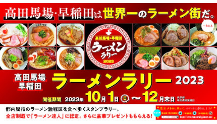 都内有数のラーメン激戦区である高田馬場・早稲田エリアのラーメン、つけ麺、油そばなどの店舗や駅、商業施設を舞台に「ラーメンで、人と店と街をつなぐ」をコンセプトに、ラーメンを通して「街をまるごと楽しむ」街巡りイベント「高田馬場・早稲田ラーメンラリー2023」が、10月1日から12月末日(参加店舗の2023年内最終営業日)まで実施されている。