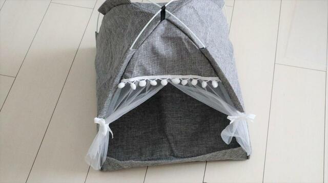 SHEINのペットテントはさまざまな色柄やデザインのものがあり迷ったのですが、部屋になじんで、なおかつディテールの可愛さが決め手となり、これに決めました。