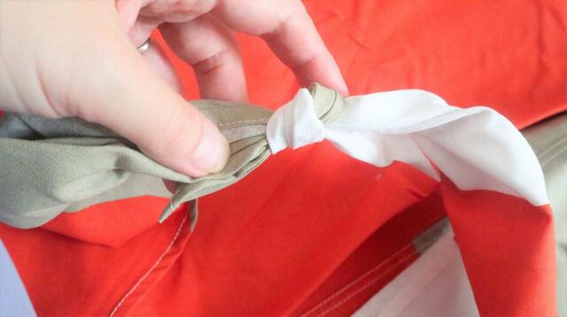 開封後、まずは両端を結んでください。風呂敷の基本の結び方は「真結び(固結び、横結び)」です。一度この方法で結べば、めったなことではほどけません。