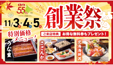 とんでんは11月3日~5日の期間、11月に創業55周年を迎えることを記念した企画の第1弾として「創業祭」を「北海道生まれ和食処とんでん」の北海道・関東における全店舗で開催する。