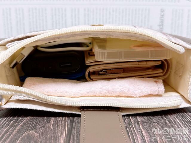 長財布はムリですが、二つ折財布・スマホ・モバイルバッテリー・ハンカチ・除菌ウェットが入りました。