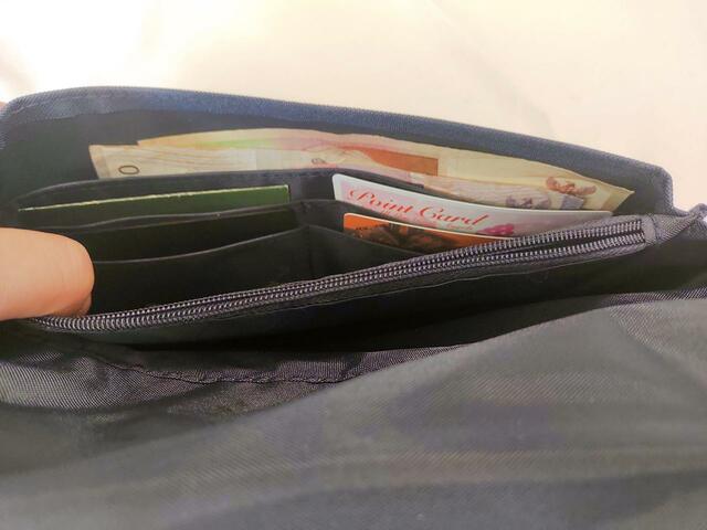 中央部の「チャック付きポケット」にミニ財布かキーケースを入れようとしたところ、ちょっと厳しかったので、カードケースを入れてみました。