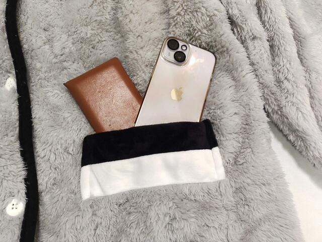 着る毛布は、両サイドにポケットもあり、口の部分に「白・黒」のラインが入っており、キュート。携帯電話などが入るサイズ感です。
