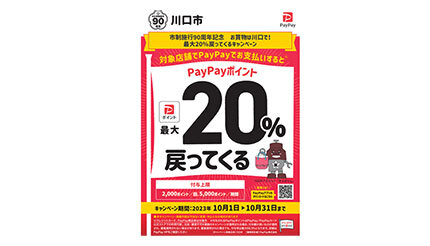 埼玉県川口市では10月31日まで、市内の対象店舗でPayPayを使って支払うと、最大20%のPayPayポイントが還元される「市制施行90周年記念 お買物は川口で! 最大20%戻ってくるキャンペーン」を開催中だ。