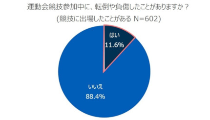 運動会の参加競技に出場中、転倒や負傷をしたことがあるかを尋ねたところ、転倒や負傷の経験があるとする回答が11.6%に達した。