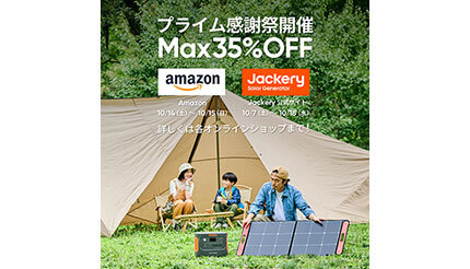 Jackery Japanは、Amazon.co.jpにて10月14日0時~15日23時59分の期間に開催される「Amazonプライム感謝祭」において、同社のポータブル電源とソーラーパネルを最大35%オフにする、特別割引セールを開催する。また、10月7~18日の期間は、公式サイトでも最大35%オフセールの開催を予定している。