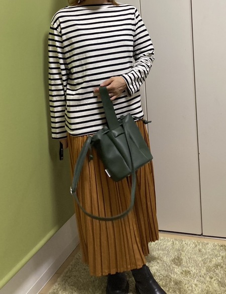 足元は革のブーツを合わせてみました。上がボーダーでカジュアルな印象なのに、光沢感のあるプリーツを合わせると一気に大人っぽく、落ち着いた印象になります。