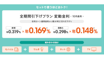 auじぶん銀行は、住宅ローンとJ:COMが提供するサービス(「J:COM NET」と「J:COM TV」のどちらか、または両方)をセットで利用すると、住宅ローン金利が最大年0.05%引下げとなる「J:COM金利優遇割」の提供を開始した。対象物件はJ:COM NET/J:COM TVエリア内の戸建。