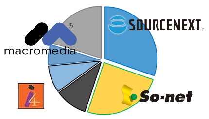 メーカー別の販売本数シェアを具体的にみていくと、ソースネクストが30.3%を獲得してトップ。2位は24.8%のSCN(ソニーコミュニケーションネットワーク)だった。3位以下は、アイフォー(10.0%)、Macromedia(8.4%)、日本IBM(6.3%)が続いた。ホームページ・ビルダーはもともと日本IBMが開発・販売をしていた。しかし、一時期ソースネクストも同製品を販売していたため、同社のシェアが高かった背景がある。また、2位のSCNは電子メールソフトの「PostPet」シリーズがけん引していた。