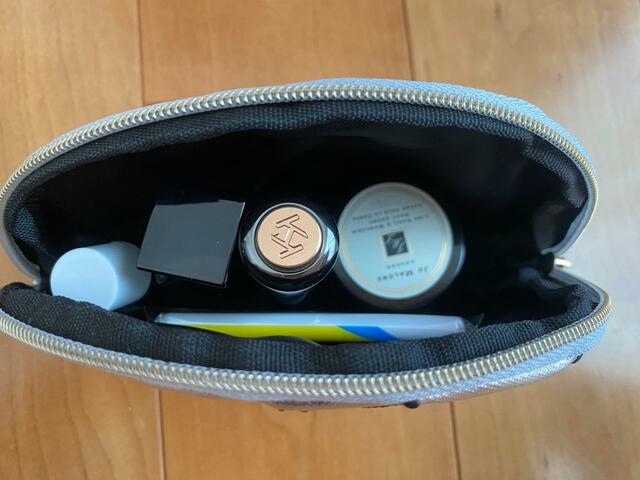 ポーチのサイズは約100×約155mm×約50mm。マチがしっかりしていて自立するタイプなうえチャックも付いているので「これは使える!」と思い、お菓子をいただいたあとに色んなものを詰めてみました。