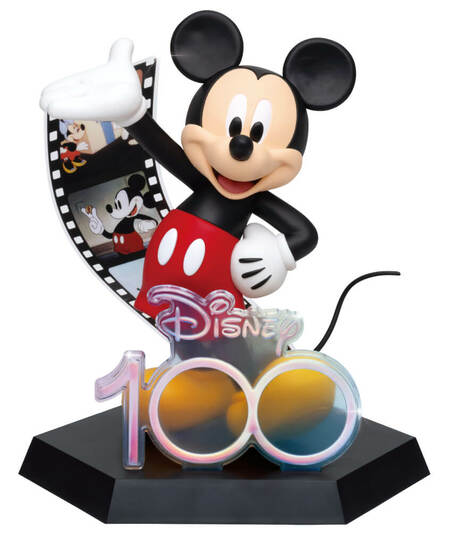 Disney100のロゴの後ろの立ったミッキーのフィギュアです。
