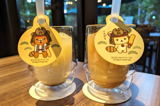 「家康風コリラックマラテ」は、リラックマの好物であるリンゴがほんのりと香る和紅茶のラテ。こちらも白玉が入っています。きなこも加わっているので、混ぜていただくことで家康公にゆかりのある「安倍川もち」のような風味に。どちらのドリンクも和スイーツのようなおいしさがありますが、きなこが好きな方はこちらがおすすめです。