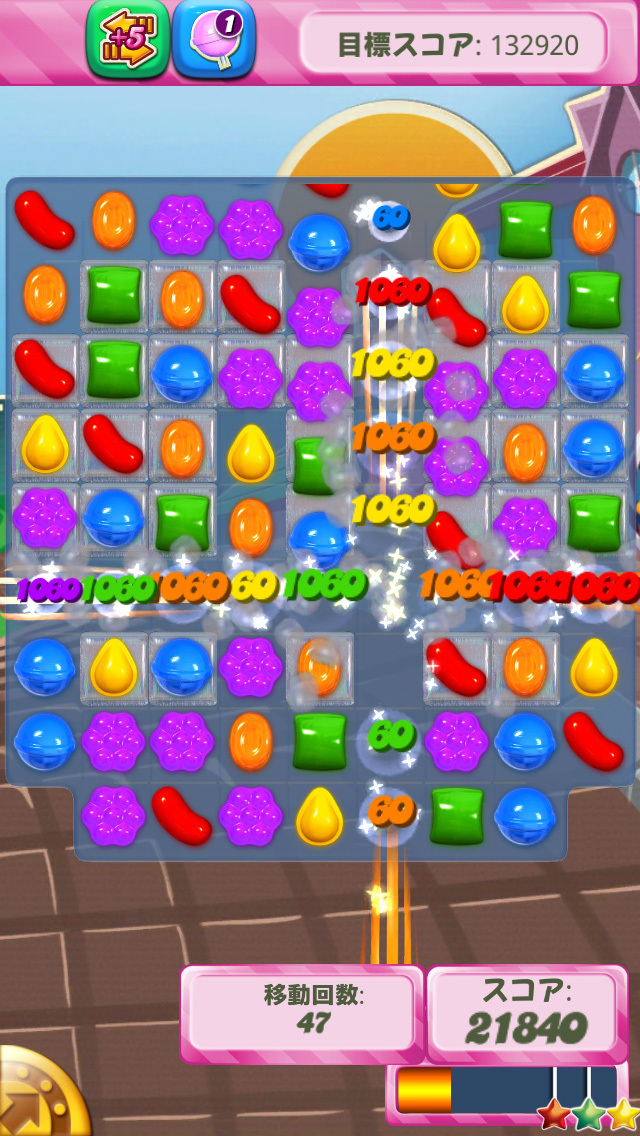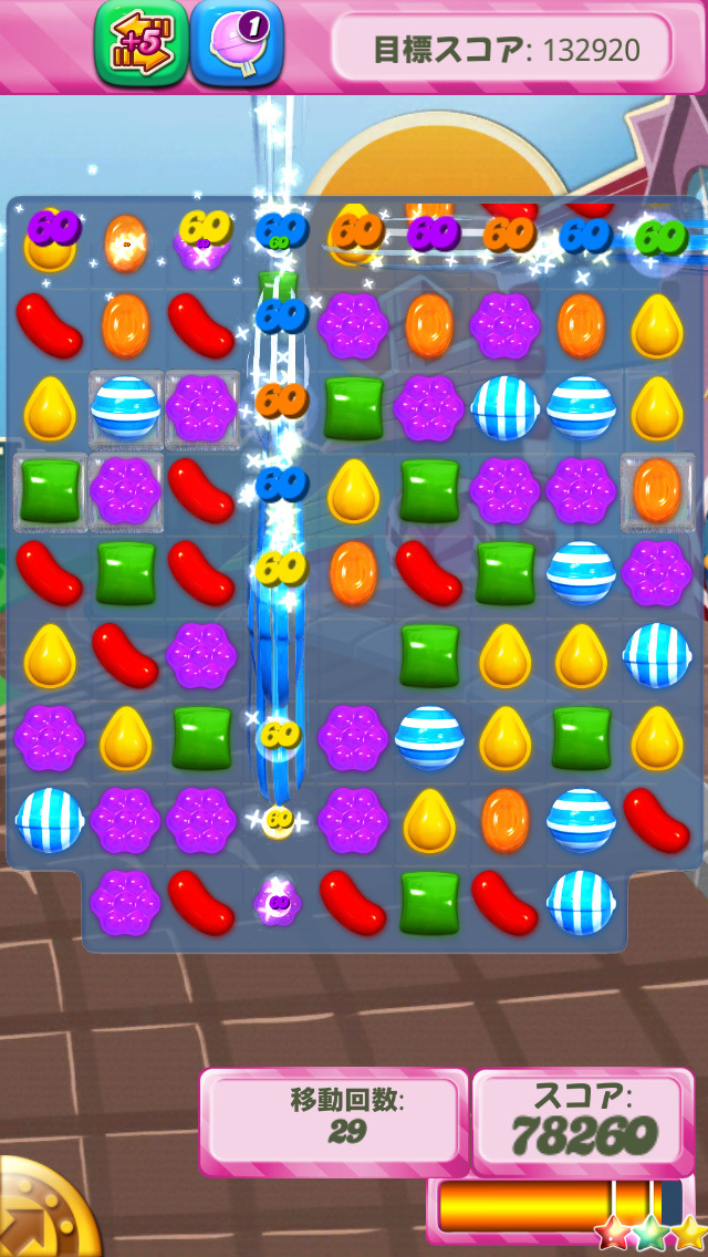 スペシャルキャンディーには何種類かあり、それぞれ消したときの効果が異なっている。たとえば4つ並べると出現するストライプキャンディーは縦、または横一列のキャンディーをすべて消し去ってくれる効果があり、比較的作りやすい。ステージにもよるが、基本的にはこのストライプキャンディーを中心に思考を組み立てていくといいだろう。
