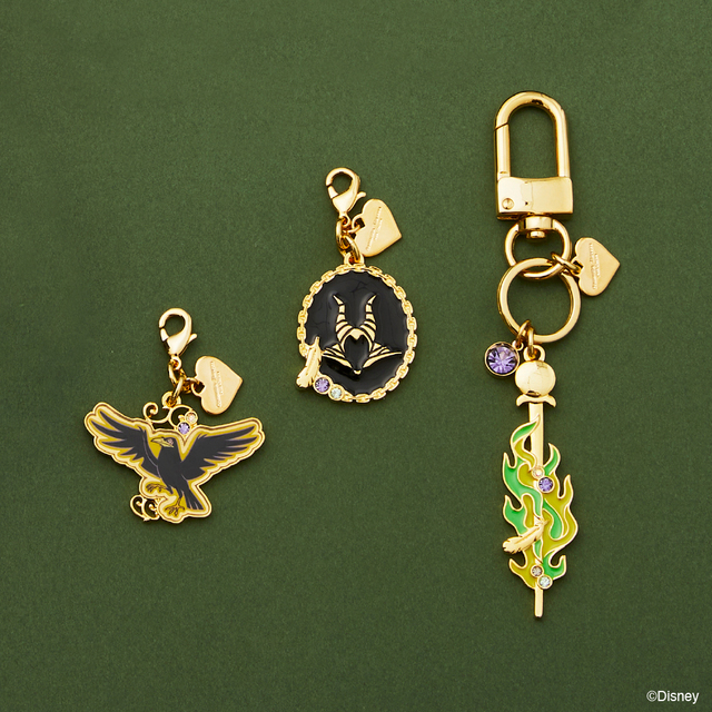 ファスナーチャームには、マレフィセントの不気味な頭をモチーフ。