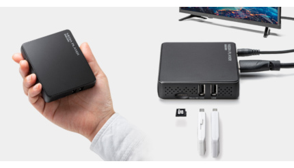 本体はコンパクトで、PCなしでの再生が可能なので、手軽に持ち運んで場所を選ばず使用できる。家庭での動画や写真の鑑賞はもちろん、展示会での動画再生や店頭でのプロモーション、役所での案内など多彩な用途での利用に対応している。