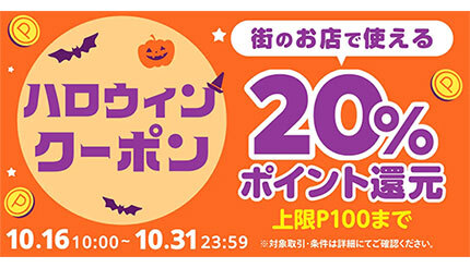 メルペイは、10月16~31日の期間、iD決済、またはメルペイコード決済対応の店舗(一部除く)、メルペイが利用可能なネットショップで税込101円以上を支払うと、支払額の20%・最大100P(100円相当)が還元される「メルペイハロウィンクーポン」を配信する。