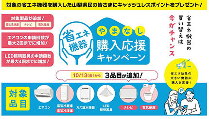 山梨県は、同県在住の個人を対象に実施中の「やまなし省エネ機器購入応援キャンペーン」について、10月13日購入分から対象製品に「テレビ」「電気冷凍庫」「電気便座」の3品目を追加し、同時に「エアコン」「LED照明器具」の応募回数を拡大した。
