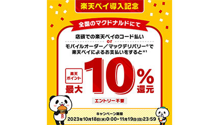10月2日から、全国のマクドナルド(一部店舗を除く)の店頭レジ(ドライブスルー含む)で、PayPay/楽天ペイ(アプリ決済)/au PAY/d払いが利用可能になった。これを記念して、日本マクドナルドは「楽天ペイ・d払いスタート記念 ポイント還元キャンペーン」を実施。楽天ペイの「10%ポイント還元キャンペーン」では、店頭レジでの「楽天ペイ」アプリのコード決済、モバイルオーダー、マックデリバリーサービスの楽天ペイ(オンライン決済)について、もれなく決済金額の最大10%分の楽天ポイントを還元する。エントリーは不要で、還元上限はない。
