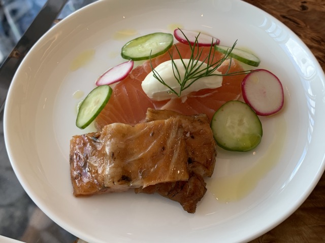 取材時は、お店のおすすめを伺って、「素焚糖と天然塩でマリネしたサーモンの燻製と骨の135℃」と「米沢牛と天元豚のポルペッティ クレソンのサラダ トマトソース」を選びました。