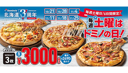 ドミノ・ピザ、「北海道3周年キャンペーン」第7弾として、土曜日に持ち帰りSピザを3枚3000円に