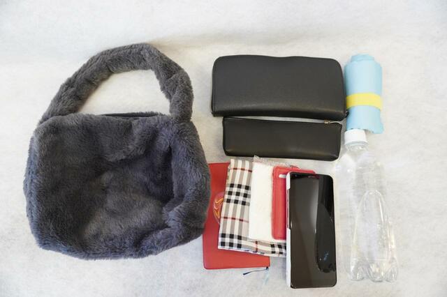 見た目はコンパクトですが、財布のほかにスマホやハンカチ、カードケースなど、お出かけに必要なアイテムは一通り入りました。