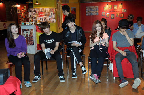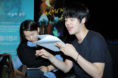 休憩時間では、タオルで汗を拭きながら水を一気に飲み干し、すぐに台本リーディングの練習を開始。休むことなく一生懸命練習している姿がとても印象的でした。他の出演者だけの練習が続いた後、ジヒョクは午前中ずっとひとりで練習していたダンスを他のキャストたちと合わせることに。