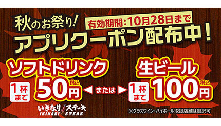ペッパーフードサービスは10月22~28日の期間、「いきなり!ステーキ」の公式アプリ登録会員(新規会員を含む)を対象に、アプリクーポンを配布している。「いきなり!ステーキ」にて、ステーキなど主商品を注文する際に同クーポンを利用することで、生ビール1杯まで100円(ハイボール、グラスワインも可)、またはソフトドリンク1杯まで50円(トクホ黒烏龍茶、レッドブル含む)になる。