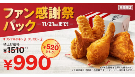 日本ケンタッキー・フライド・チキン(KFC)は10月25日~11月21日の期間、「ファン感謝祭パック」(990円)を全国のKFC店舗(一部を除く)で販売する。KFCは10月25日に値上げを実施することから、オリジナルチキン/骨なしケンタッキーは290円から310円に、カーネルクリスピーは270円から290円になる。結果的に「ファン感謝祭パックA」の積上げ価格は従来の1410円から1510円に、100円アップする。990円で購入できる、このチャンスを逃さないようにしよう。