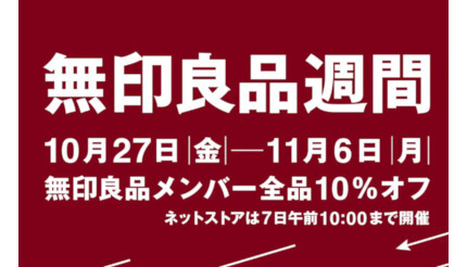 無印良品では10月27~11月6日(ネットストアは7日午前10時まで)の期間、無印良品メンバーを対象に全品10%オフになるキャンペーン「無印良品週間」を開催する。