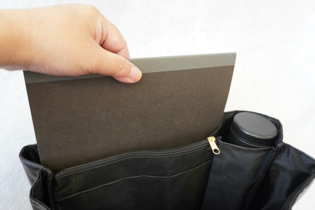 水筒やタンブラーなど、縦で持ち歩きたいものがあるときは、こうした専用のスペースがあると横に倒れる心配がないので安心です。