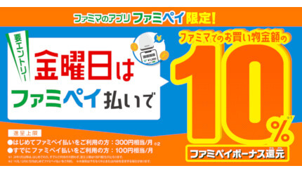 期間中、エントリーのうえ、金曜日にファミリーマートでファミペイ払いをすると、買い物合計金額の10%を期間限定ファミペイボーナスで後日進呈する。期間限定ファミペイボーナスの進呈上限は、11月・12月に当月初めてファミペイ払いを利用した人は300円相当、すでにファミペイ払いを利用したことのある人は100円相当。