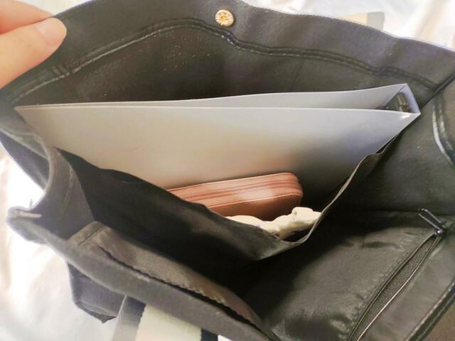 私物を入れたところ、バッグはマチがたっぷりあるので、たくさんのアイテム(長財布・ポーチ2種類・水筒・500mlペットボトル・うちわ・手帳・マルチケース・A4クリアファイル・キーケース・携帯・カードケース・カーディガン・帽子)を詰め込むことができました。