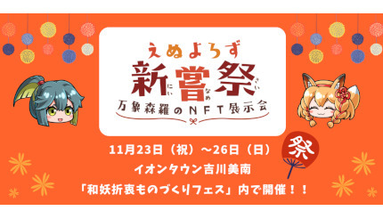 万象森羅とMONZZ factoryは11月23日~26日の期間、NFT展示&創作物販イベント「えぬよろず新嘗祭(にいなめさい)」を、イオンタウン吉川美南(埼玉県吉川市)にて開催する。入場は無料。