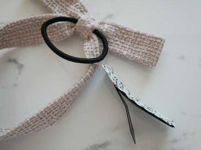 『ツイードゴムピンセット』は、ほっこりとしたツイード素材が秋冬らしいポニーとヘアピンのセットです。