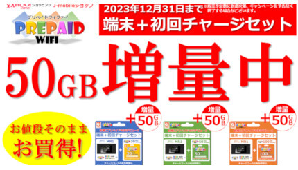 ジャパンモバイルは10月27日~12月31日の期間、Yahoo!ショッピングの「J-mobileショップ」にて販売している、「プリペイドWiFi」の「MR1端末本体+初回チャージ(30GB、50GB、100GB)セット」を、価格はそのままで50GB増量して提供している。
