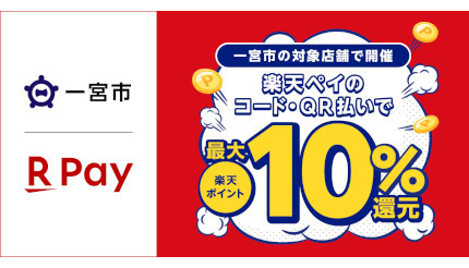 キャンペーンでは期間中、愛知県一宮市内の対象店舗で「楽天ペイ」アプリを利用して支払うと、決済金額に対して最大10%分の「楽天ポイント」が還元される。還元ポイントの上限は1回当たり1000ポイント、期間中5000ポイントまで。