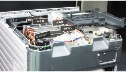 ドラム式洗濯乾燥機で衣類を乾燥させるとき、ヒーター式は内蔵ヒーターの熱で衣類を乾かし、ヒートポンプ式は熱交換器を使って除湿で乾燥させる。ヒーター式は電力でヒーターの温度を上げるため、ヒートポンプ式の方が省エネなのである。