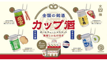 新商品は、日本屈指の酒どころとして名高い新潟や秋田などで醸されている、実在するカップ酒をボールチェーンマスコットとしてフィギュア化した。ラインアップは、「新潟『北雪 金星 カップ酒』とイカの一夜干し」、「秋田『出羽鶴芳醇つるカップ』といぶりがっこ」、「高知『酔って候 純米カップ』と鰹のたたき」、「和歌山『錦郷カップ 浦島太郎』とめはりずし」の4種類。ロゴやイラスト、色使いなど、ラベルやフタのデザインを忠実に再現した。それぞれ異なる瓶部分の形状も、本物と何度も見比べて忠実に再現している。