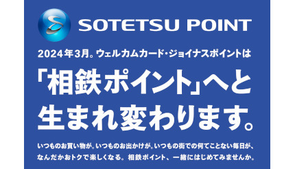 相鉄ポイントの開始にあわせ、現在、相鉄グループの各商業施設でたまる「ジョイナスポイント」と、そうてつローゼンの「ウェルカムカードポイント」を「相鉄ポイント」に統一する。切り替え手続きを行うことで、保有するポイントは「相鉄ポイント」で継続できる。