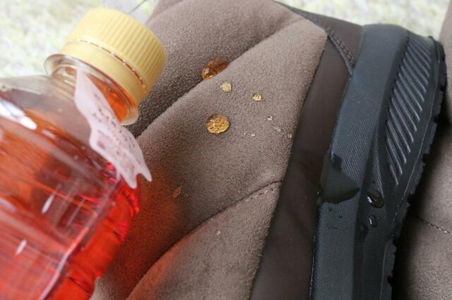 ワークマン独自の耐久撥水加工がされていて、水や泥汚れがつきにくくなっています。実際にペットボトルのお茶をかけてみましたが、すぐに弾いて水滴となり流れていきました。