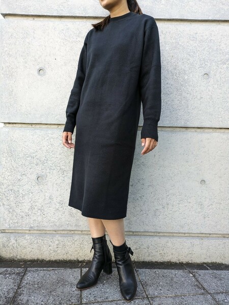 まずはワンピース1枚で着てみましたが、直線的な服のラインが身体のラインを必要以上に拾わず、スッキリとみせてくれます。
