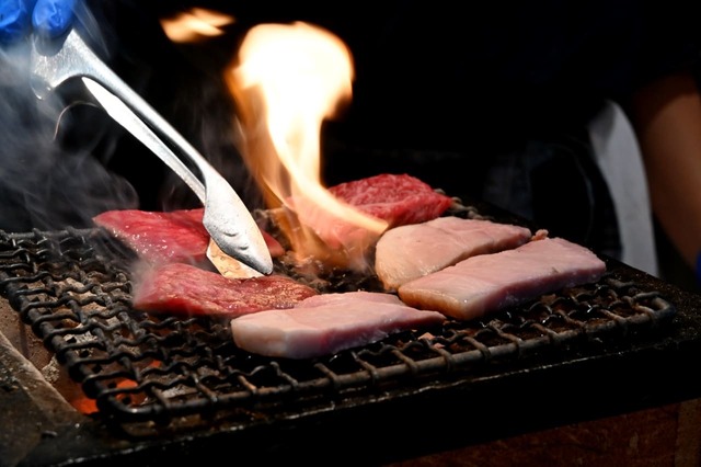 希少部位の牛肉「カイノミ」や桃茶豚のロースは七輪で焼肉に。「山梨県産 信玄鶏のロースト」「仔羊のロースト」「三重県産 松坂豚」など、その場でカットしてもらえる豪快なお肉が楽しめます。
