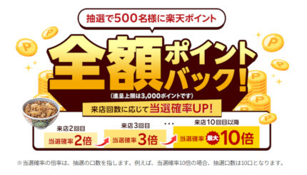 楽天ペイメントは11月1日~30日23時59分の期間、共通ポイントサービス「楽天ポイントカード」において、吉野家が運営する全国の「吉野家」店舗(一部を除く)で「楽天ポイントカード提示すると抽選で500人に全額バック!」キャンペーンを実施している。
