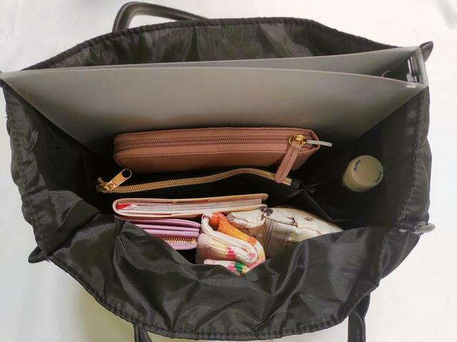 実際にどのくらい入るのか試してみると、たくさんのアイテム(長財布・携帯・ハンカチ・ポーチ・A4ファイル・手帳2種類・500mlペットボトル・カードケース・キーケース)を収納できました。