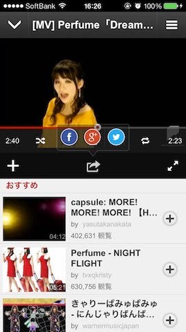 気に入った動画が見つかったら、「+」マークで「私の音楽」に登録したり、中央のシェアマークでFacebookやTwitterで友達とシェアして楽しむのもいいですよね。「私の音楽」に入っている曲はオフラインでも聴くことができます。