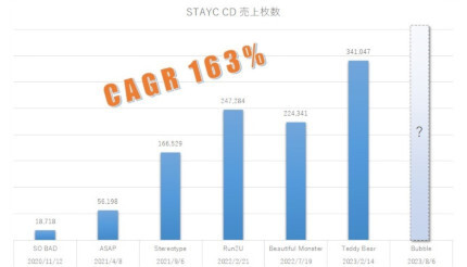 STAYCはデビュー当初、あまり注目されていませんでした(個人的な見解で特に日本)。2枚目のシングル「ASAP」はキャッチーなメロディでSNSでもバズり、知名度が上がりました。その勢いに乗って3枚目のシングル「Stereotype」ではCDの売上も大きく伸び、デビュー後初めて音楽番組で1位を獲得することができました。筆者調べではありますが、CDの売上枚数は伸びています。最新CDの「Bubble」は売上枚数が分かりませんでしたが、着実にファン層を増やしています。