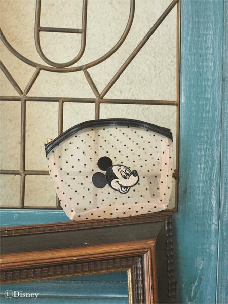 透け感のある中にミッキーとミニーのフェイスが刺繍され、ベージュとブラックの配色でクラシカルな雰囲気を漂わせます。