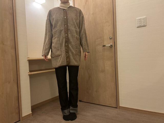 裏面のボア地をデニムと合わせ、カジュアルに着こなしてみました。